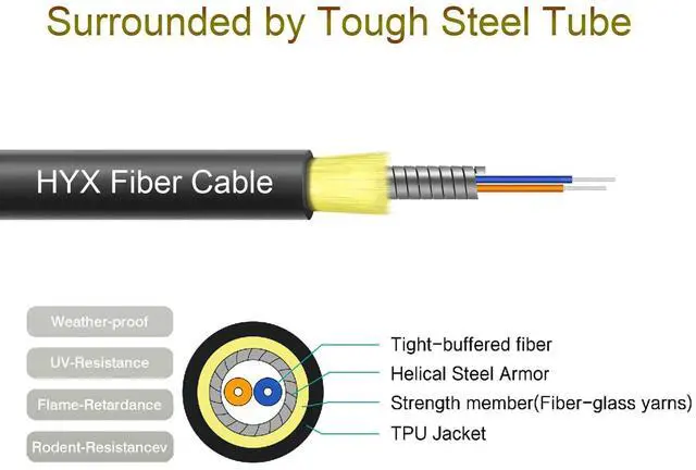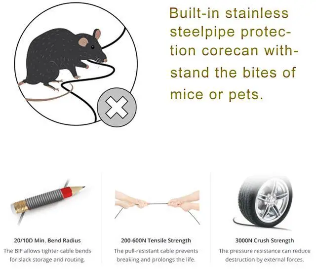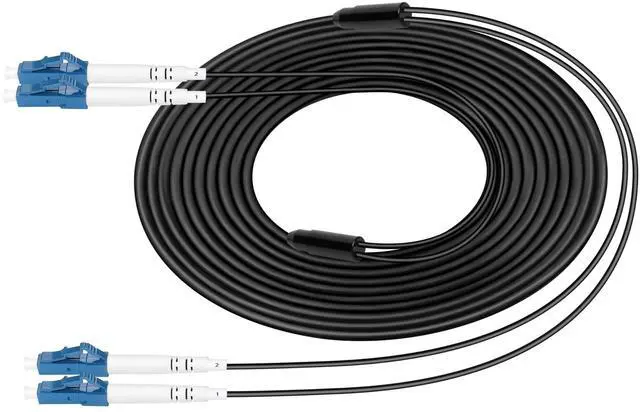 TPU JACKET LC FIBER CABLEThe fiber optic patch cable TPU jacket features strong tensile strength 500/800N, high abrasion resistance 2000/3000 N/100mm, waterproof, high and low-temperature resistance -40 to 176, UV-resistant, and bending resistance. ^^ ARMORED OUTDOOR FIBER PATCH CABLEThis lc to lc fiber patch cable built-in a stainless steel tube inside to protect the inner core (fiber glass) from damage like pet chew. it remains all the features of a standard fiber optic cable, but is much stronger. ^^ LOW SIGNAL LOSS ATT FIBER CABLEThis os2 single mode fiber is designed to minimize signal loss, and high reliability, insertion loss of 0.3 dB and return loss of 50dB.