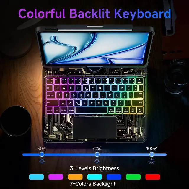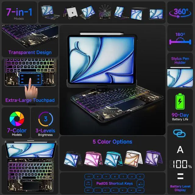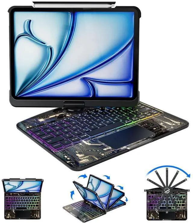 Unique Clear Design & Multiple Compatibility Designed exclusively for iPad Air 13 inch (M3 2025 / M2 2024), iPad Pro 12.9 inch (2022/2021/2020/2018), models (A2898A2899A2900A3268A3269A3271A2436A2437A2764A2766A2378A2461A2379A2462A2229A2069A2232A2233A1876A2014A1895A1983). Please confirm your iPad model before purchasing. ^^ 7 Colors RGB Backlit Keys & 3 Adjustable Brightness Levels The Clear ipad keyboard case comes with 7 different color-coordinated RGB backlit, and the backlit projects beautiful colors through laser-etched key characters and letters. 7 RGB colours backlit keys for comfort and productivity in any dimly lit area. ^^ 360 Rotatable Stand & 7 Viewing Angles Effortlessly pivot your iPad for typing, working, sketching, watching videos, or video calls.