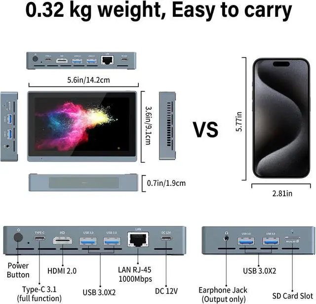 Drawing under 10 watts of power. Its metal body helps to expel heat quickly and the device is completely silent, improving efficiency. With the latest wireless connectivity. The tiny PC with WiFi 5.0, dual-band WiFi 2.4G / 5.0G, it provides speeds up to 450Mbps/ 2.4GH z and 1000Mbps/5GHz. Gigabit Ethernet supports 10/100/1000Mbps, Bluetooth 4.2 fast data transfer speed up to 2Mbps. ^^ Rich Build In & I/O PortsHandheld pc all important connections are available, 1 x TYPE-C (Full function), 4 x USB 3.0, 1 x HDMI 2.0, 1 x RJ45, 1 x Headset, 1 x SD card Shot, 1 x DC Port (12V), If mini PC ports are not enough for our daily computer use, we can connect the expansion port through the full-featured USB C port.