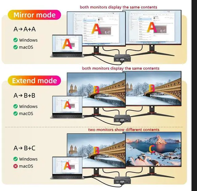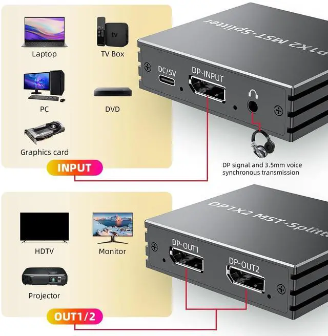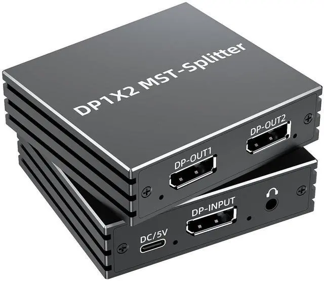 Know: This DisplayPort splitter 1 in 2 out with audio out has limits. Please kindly check the note below: 1) This dual monitor displayport splitter cannot increase the video outputs of your PC or laptop if they do not support MST2) Pls kindly check the documents of your video cards carefully to make sure they support DisplayPort MST3) The DisplayPort cable splitter for dual display does not support MST mode when used with Mac OS, such as MacBook Pro, MacBook Air, and Mac mini. It is also true when your Macs are running windows & mac Os4) When using with Mac os, you can only switch the mode to SST mode, otherwise, there will not be a video out5) Under MST mode, the Max. Resolutions are 3840X2160@120Hz, while under SST mode, it can be up to 4K@144Hz6) The resolutions and other features are subject to the capabilities of all connected devices7) Pls use standard DisplayPort 1.4 cables or higher version DP cables with our DP to DP splitter for 2 monitors. Most sync issues are caused by poor cables8) A 5V 1A External power supply is always neededFeatures: DisplayPort to Dual DisplayPort Monitor SplitterDisplayPort Female to 2-Port DisplayPort FemaleIndependent audio output portSupports resolutions up to 4K@144Hz under SST mirror modeSupports resolutions up to 4K@120Hz under MST modeWindows & Mac OS compatible (pls check limits) 5V External power supply for reliabilityPacking