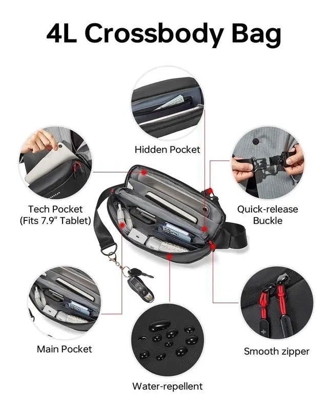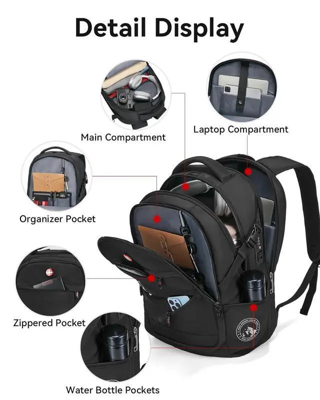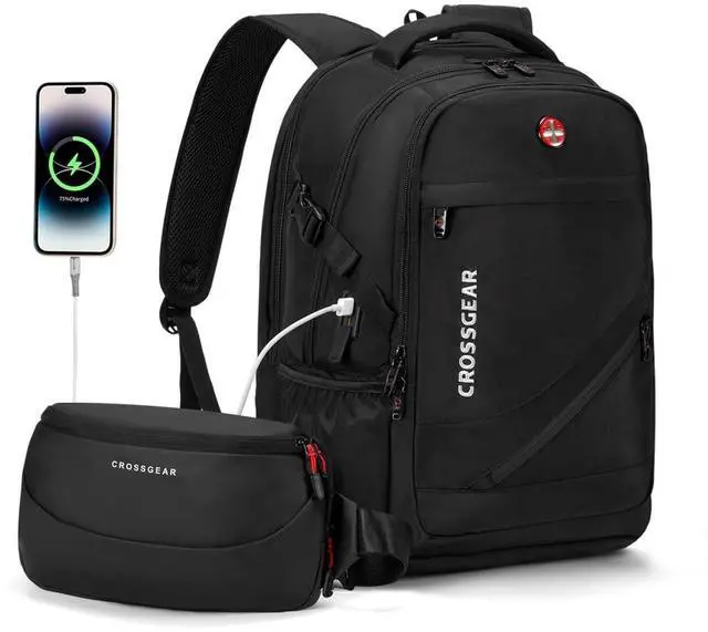 ^^ Lockable & Anti-Theft PocketWith the anti-theft combination lock on the laptop compartment. A hidden anti-theft pocket against the back keeps passports and wallets safe in crowded spaces. ^^ Lightweight Sling Bag for Flexible CarryThe set includes a detachable sling bag that can be quickly converted into a crossbody bag and waist bag in seconds with its quickrelease buckle. Perfect as a standalone sling bag for daily use or as a handy front pocket for your main backpack, it offers ultimate flexibility. ^^ Durability & Airline ApprovedMade from waterproof polyester with metal zippers, this sleek black backpack is built to last.