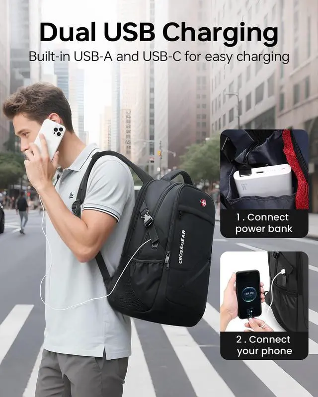 2-in-1 Travel Backpack SetThis 25L large-capacity travel backpack features 3 compartments & 10 pockets. The padded laptop sleeve securely fits 14- 17.3 inch computer. It organizes clothes, tech, and daily essentials. 4L sling bag holds a 7.9 -inch tablet, phone, passport. Perfect for college, work or business travel. ^^ Breathable & Travel-Friendly DesignStay cool with the U-shape airflow back panel and wide mesh straps. A built-in side charging port offers on-the-go power. The rear trolley sleeve slides over luggage handles, making airport transfers effortless for men and women on the go.