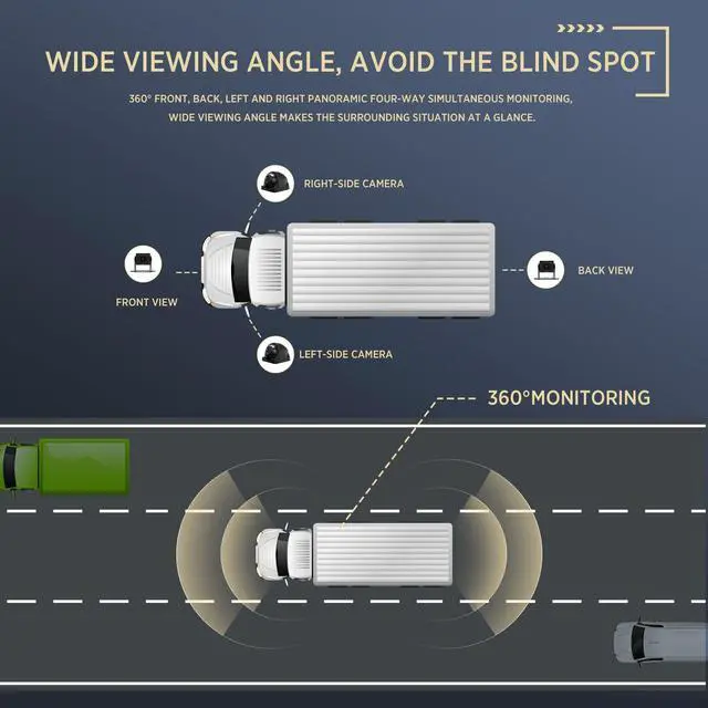 Excellent water resistance, safe to use in sunny or rainy days. Sharp clear night vision & 170 wide viewing angle allows us capture the clear image quality on any conditio, help us to observe everything surrounding us, avoid the blind spot and safer driving. ^^ 4 Split ISP HD Touchscreen Monitor & Built-in DVR Recording Function - Wide 10.36" Screen. Backup camera system supports quad view display, a total of 4 video inputs from the front and rear cameras and 2 side view cameras can be displayed on the screen. 4 split screen, 4 channels, 4 different angles help us to get a 360 view to make driving safer.