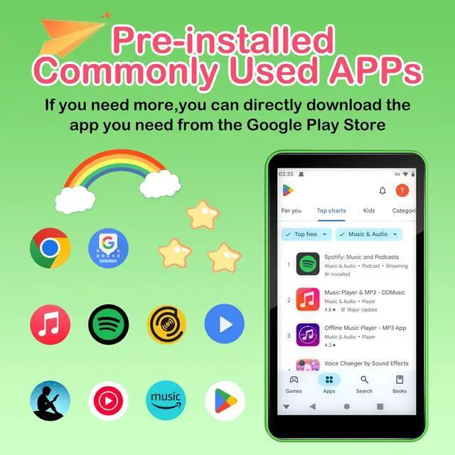 & entertainment: Download Netflix, Duolingo, Spotify, and educational apps on this Android 11 OS media player. Parent-approved content filters included. MP3 players suitable for teenagers aged 14 and above and adults ^^ 160GB Sports & Fitness Powerhouse Clip this ultra-lightweight ( 4.2 oz) MP3 player to gym gear! Stream wireless music via Bluetooth 5.0 or offline 160GB storage (32GB ROM + 128GB card) for workout playlists/running guides ^^ Preloaded Streaming + Offline Playback Pre-installed Spotify, YouTube Music, FM Radio & Audible. Download songs/stories via dual-band WiFi or play offline. Perfect for car rides, school zones, or no-signal areas ^^ Massive 160GB for Students & Teens Store 40, 000+ songs, 500+ HD videos, or years of academic podcasts/audiobooks. Share files via Bluetooth/WiFi Direct ideal for class projects or group study ^^ 10-Hour Battery + USB-C Fast Charging 2000mAh battery lasts all day (5hr video/10hr audio). Fully charges in 60 mins via USB-C use any phone charger/power bank. Play while charging during long flights/camping ^^ 4" HD Touchscreen + Military-Grade Parental Control Shock-resistant rubber frame and eye-protection display. Remotely block apps, set screen time limits, and filter explicit content via parental dashboard.