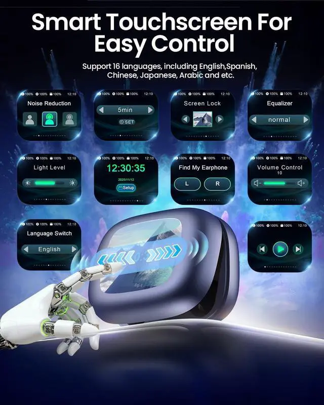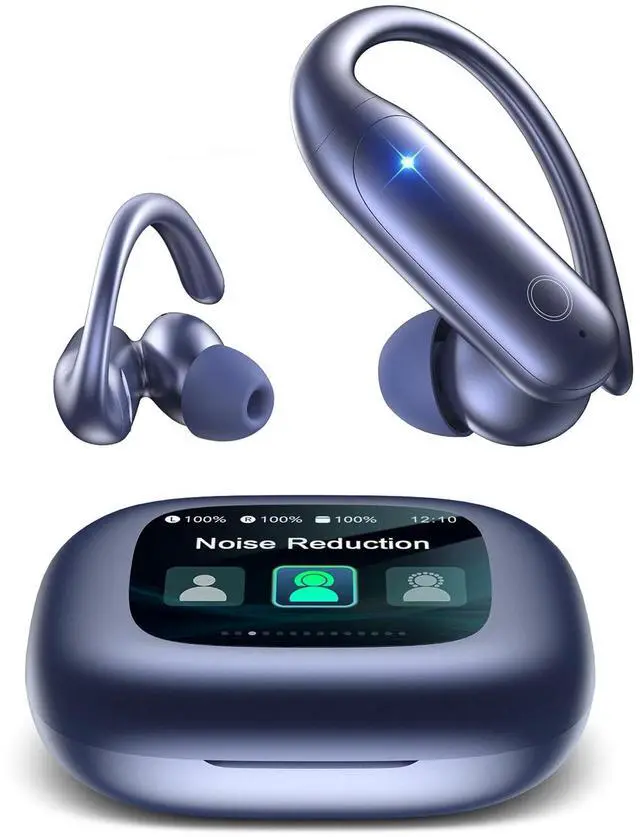 REVOLUTIONARY TOUCHSCREEN CHARGING CASE Experience next-level convenience with the TP03 wireless earbuds. The smart charging case features a responsive touchscreen that lets you play music, adjust volume, switch between ANC/Transparency modes, toggle 5 EQ presets (Normal/Rock/Classic/Pop/Jazz), and even trigger your phones camera remotely for perfect hands-free shots. Customize the screen with 5 preset wallpapers, or use the Find My Earbud feature on the intuitive 16-language interface to make misplaced earbuds beep. Everything you need is right at your fingertips. ^^ SECURE, WATERPROOF FIT FOR ANY WORKOUT Designed for intense sports, each of these ear buds features a flexible over-ear hook that stays securely in place during running, training, and gym sessions.