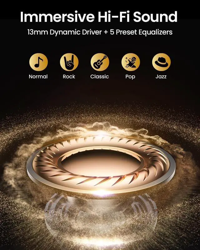 Weighing just 7.1 g ( 0.25 oz), they feel incredibly light. With IPX7 waterproof protection against sweat and rain, and three included silicone ear tip sizes (S/M/L) for a perfect seal, you get unwavering stability and all-weather confidenceno slipping, no distractions. ^^ PREMIUM HI-FI SOUND & SMART NOISE CONTROL Immerse yourself in exceptional audio powered by a large 13mm dynamic driver delivering deep bass and crisp highs. Choose from 5 preset EQ modes Normal, Rock, Classic, Pop, or Jazz to match your listening style. Seamlessly switch between Active Noise Cancellation (ANC) for full focus and Transparency Mode for situational awareness, via the touchscreen case or simple triple-tap controls.
