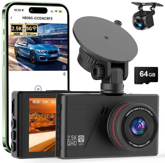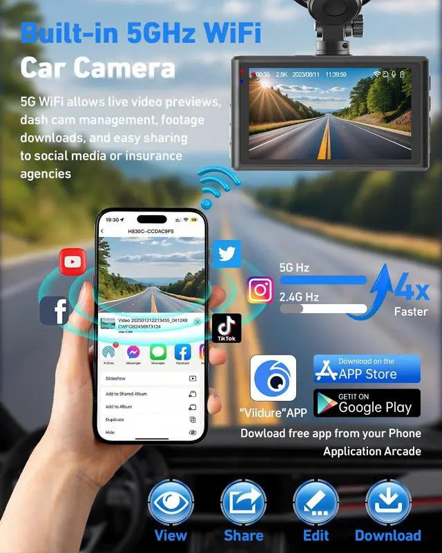 [ 2.5K + 1080P Wide-Angle Dual Dash Cam] --- The forward-facing camera captures footage in 2.5K (25601440P@30fps) with the interior/rear camera recording in 1080P (19201080@30fps), providing crisp detail for enhanced readability of street signs and license plates. Featuring a 170 ultra-wide front lens and a 140 wide-angle rear lens, this dual dash cam system expands your perspective, minimizes blind zones, and delivers a more secure, reliable driving experience ^^ [Built-in 5G WiFi & App Control Dash Cam] --- This dual dash cam system features integrated 5G WiFi for faster data transfer and a stable connection to the "Viidure" app, available on both iOS and Android devices.