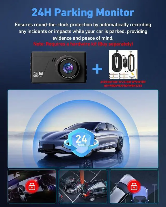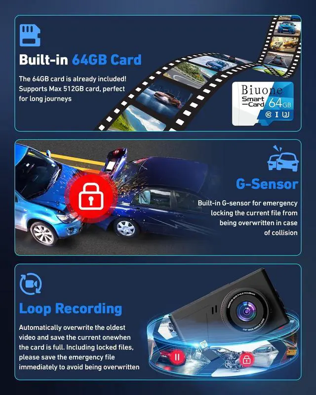 Note: The WiFi function operates within a 35 meter radius and does not support remote access from outside the vehicle ^^ [Loop Recording & 64GB Card Dash Cam] --- This dual-channel dash cam is equipped with an integrated 64GB memory card for instant use out of the box. No need to buy an extra card separately. With continuous loop recording, the system automatically overwrites the oldest recordings to free up space, providing a seamless recording experience. It retains both routine and emergency-locked files separately. In case of incidents, promptly save essential videos to avoid them being overwritten ^^ [24/7 Parking Monitor & G-Sensor Dash Cam] --- This dash cam integrates advanced G-sensors and a 24-hour parking surveillance mode, which automatically detects incidents and secures the relevant footage. In the event of a collision, it instantly locks the current recording as potential evidence. The 24/7 parking mode ensures continuous monitoring to protect your vehicle day and night (requires hardwire kit, sold separately) ^^ [Advanced Night Vision Dash Cam] --- The Biuone dash cam utilizes a high-definition CMOS sensor combined with a professional 6-layer glass lens and a large F 1.8 aperture.