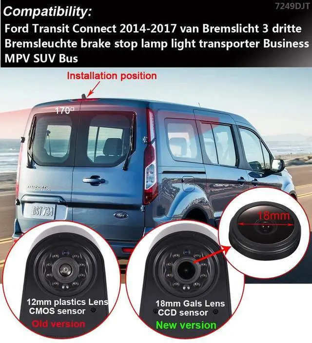 Dear customer, Please must check the camera size and appearance before place an order, see if can fit your car brake light place size and appearance! Because the same car model in different countries may have some difference, please check the camera size and compare the installation of your car carefully to avoid mistake. This product could fit for all below models as expected: Replacement for Ford Transit Connect 2014-2017 Transporter Business MPV SUV Bus-