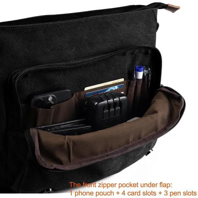 4 Interior Pockets: Front zipper pocket under flap (1 phone pouch, 4 card slots, 3 pen slots) for easy access of frequent use stuffs. One main compartment with one protective padded laptop sleeve for 15.6" and a zipper pocket for your value essentials like wallets, confidential documents etc. ^^ 4 Inch wide & adjustable thick strap that can adjust from 29 to 55" which made it convenient to switch between a crossbody bag and a shoulder bag. Comfortable soft cotton webbing enough to make your shoulder free of fatigue.