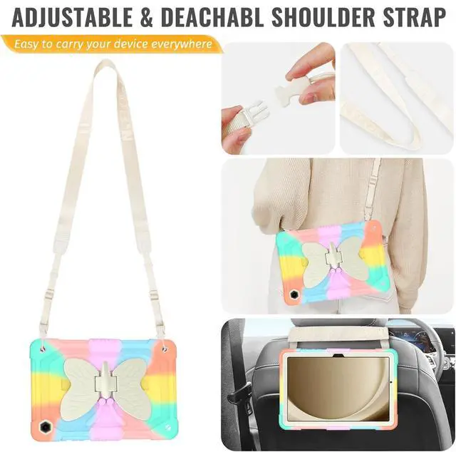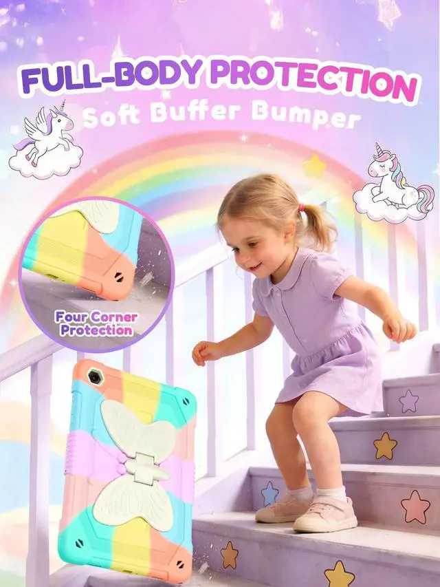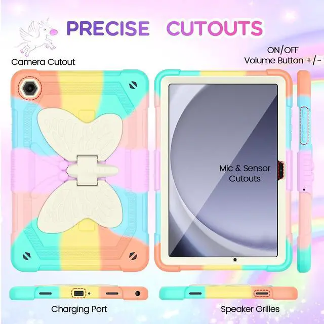 Please Note: Without a screen protector ^^ Butterfly Kids Case for Galaxy Tab A9 Plus 11 inch has a built-in double sturdy kickstand on the back, the double kickstand is designed for multi-angle watching. Fits every occasion, when doing yoga, cooking, climbing, watching, working, trips, etc. Full access to all features (Cameras, Speakers, Ports, and Buttons) ^^ Detachable and Adjustable Carrying Shoulder Strap - The shoulder strap of DreamerX galaxy tab A9+ tablet Case is detachable and adjustable, both kids and adults can use it to carry the tablet around during hiking, traveling or other activities outside. Also, you can also hang the tablet on the back of seat for fun when traveling in cars ^^ UNIQUE TABLET MINI KIDS FRIENDLY CASE - The Buddy case is combined with a high-grade polycarbonate hard shell and a soft silicone cover. The food-grade silicone is quite thick and soft, it can absorb the impact from an accident drop or shock. Completely safe for kids! Kids like to bite things, worry no more! Also, we take special paint coats on our soft silicone outer to gain a comfortable hand feeling.