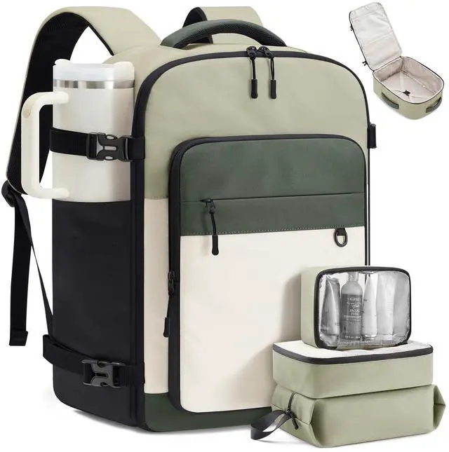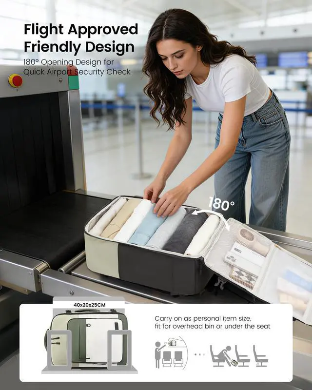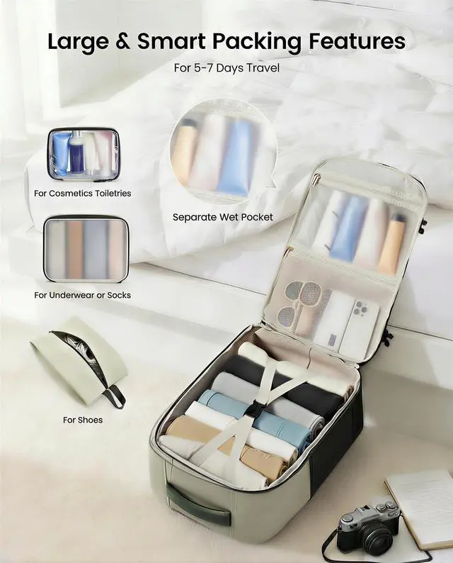 A separate padded laptop sleeve with EVA foam protects your 17'' laptop and 12.9 '' iPad, while the front organizer panel keeps small essentials tidy and within reach. ^^ With 3 Packing Cubes and wet pocketsThis waterproof travel backpack for women includes 3 bonus packing cubes (2 storage bags + 1 shoe bag) to neatly organize underwear, socks, and small items. The 42cm shoe bag fits 12 pairs of shoes. A leak-proof, water-resistant wet compartment keeps toiletries and damp clothes separate, so everything else stays dry and clean. ^^ Thoughtful Travel DesignThis carry on backpack for travel features a suitcase-style 180clamshell opening for quick security checks.