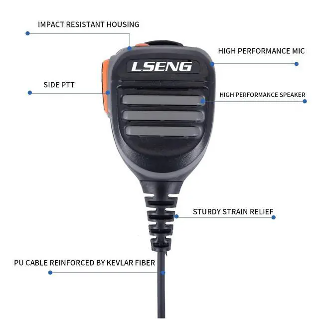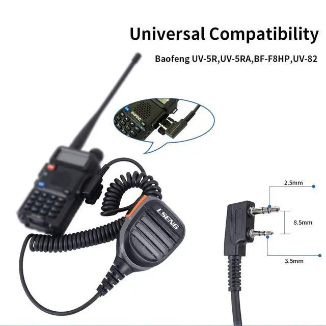 [Loud and ClearLSENG Shoulder mic is designed to pick up your voice with sensitivity, ensuring smooth transmitting even in high ambient noise environments. Perfect for use in police, military, nightclubs, paintball, security, restaurants, and other noisy environments. ^^ [Long Term UseConstructed with flexible and durable cables that have good elasticity, our mic is built to last. The electroplating anti-oxidation design of the two-pin standard diameter 2.5 mm and 3.5 mm connectors improves the longevity and prevents poor contact. ^^ [Extended CompatibilityOur radio mic is compatible with Baofeng 5RA 5RB 5RC 5RD 5RE 3R+ 5REX 5RX3 UV-5R+Plus GT-3 BF-888s Walkie Talkies.