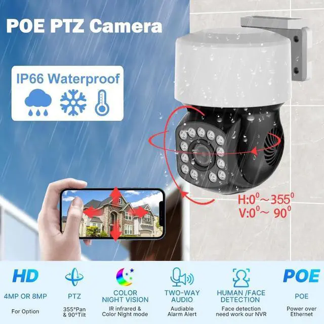 Wide Compatibility&IP66 Waterproof: IP 66 Waterproof standard of our indoor security camera can withstand changeable environment, no matter in rainy day or severe weather for indoor or outdoor use, and our PTZ camera is compatible with batsee PoE camera system (You may need to modify the Camera IP Address to similar with PoE NVR at first use) ^^ Color Night Vision&Sound Light
