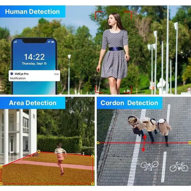 Color Night Vision: When human is detected, spotlight of the home camera will be triggered to ward off suspicious objects. While sending email alerts and APP (XMeye app) notifications to your smart device. Three night vision modes to choose, like infrared black&white, floodlight full color, and auto smart color night vision (default) ^^