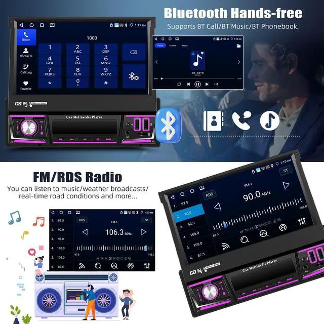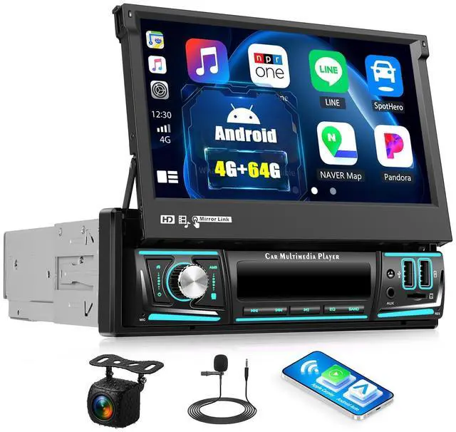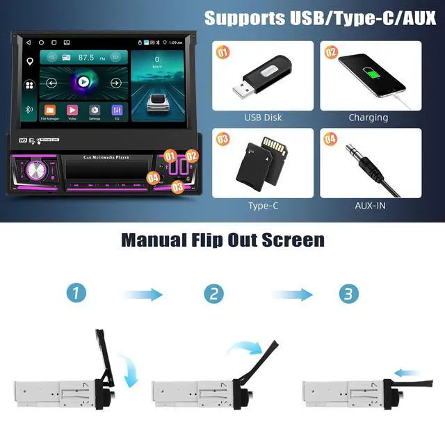 Upgrated Android 13&7 Inch Manual Foldable Car StereoCar radio equipped with the latest android 13 system,4GB RAM + 64GB ROM, running smoothly in colleges and universities. Applicable to the center console of most cars, supports single din.7-inch screen with full viewing angle, enjoy high-definition colorful pictures