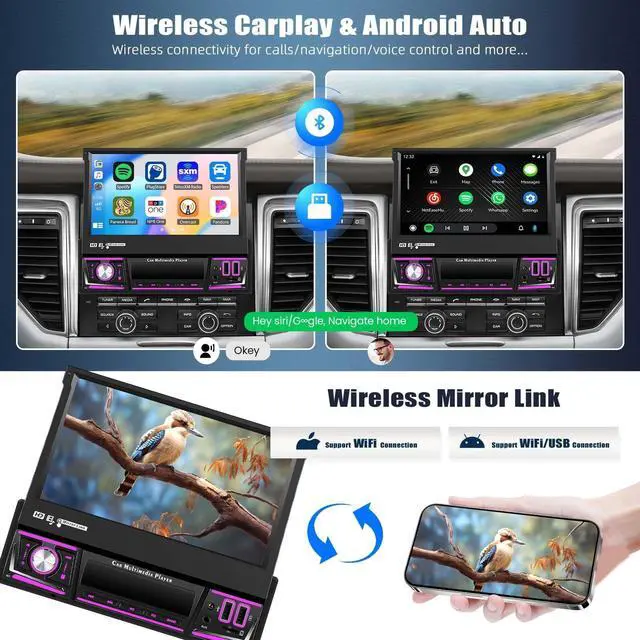 Built-in Android Auto&Carplay&Mirror LinkCar radio touchscreen support wired & wireless Carplay and Wired Android Auto. Just connect via USB or Bluetooth, you can project the contents of your phone to the large screen of the host. Easily access your phone to make calls, navigate, play music or manage other apps via Siri/Ggle controls.Mirror link function, Android connects via USB and WiFi, ios connects via WiFi