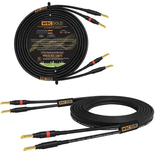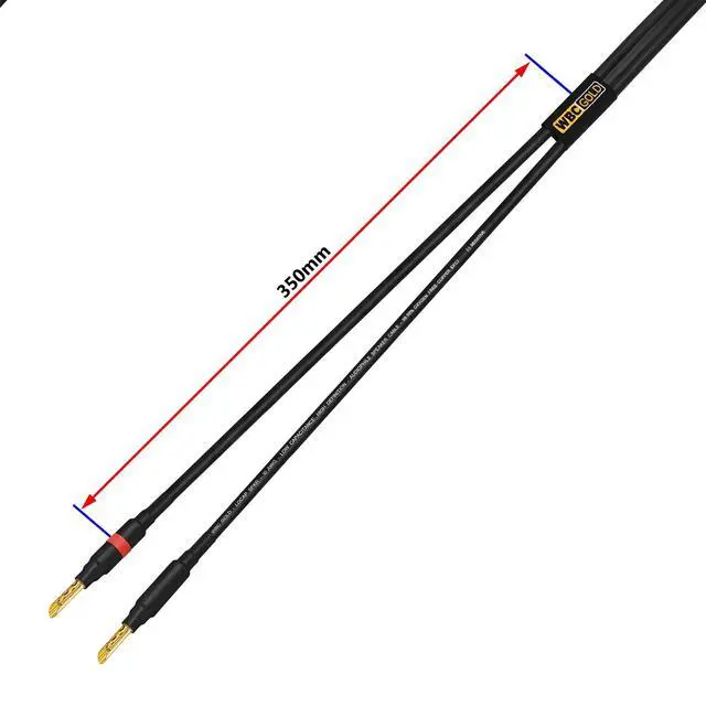 The additional distance between the 2 cores ensures probably the worlds lowest capacitance and the lowest inductance for a speaker cable in the sub $200 price range. These conductors are then covered by a proprietary PVC-blend for tough yet highly flexible outer jacket. ^^ At WBC we only use the highest-grade connectors for these audiophile cable assemblies. Eminence 3 micron, 24K Gold plated, audiophile-grade, 4mm (standard diameter) banana plugs with a fully insulated body to prevent accidental shorting, provide superior abrasion & corrosion resistance and unrivaled performance. The banana plugs are specially reinforced to support heavy gauge cables (special shaft inside).
