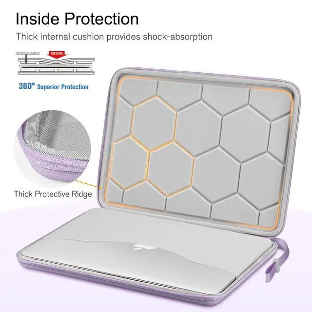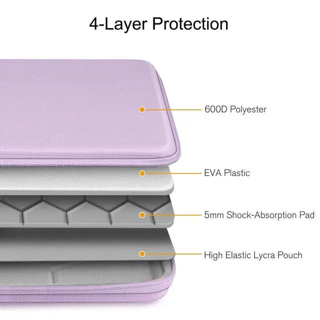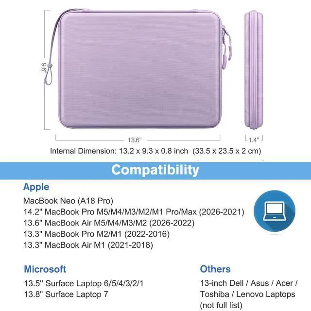 Wide CompatibilityInternal Dimension: 13.19 x 9.25 x 0.79 inches, compatible with 13.6" MacBook Air M5 A3449 M4 A3240 M3 A3113 M2 A2681 (2026 2025 2024 2023 2022), 14" MacBook Pro M5/M4/M3/M2/M1 A3434 A3401 A3185 A2918 A2992 A2779 A2442 (2026-2021) Pro/Max, 13-inch MacBook Neo 2026 A18 Pro chip, 13.3" MacBook Air M1 A2337 A2179 A1932, 13.3" MacBook Pro M2 M1/A2338 A2251 A2289 A2159 A1989 A1706 A1708, 13-inch iPad Pro M4 / iPad Air M2 2024, 12.9 '' iPad Pro 6th/5th/4th/3rd Gen, Compatible with Microsoft Surface Laptop 13", Surface Pro 12", Surface Laptop 13.8 '' 7 2025 13.5 '' 6/5/4/3/2/1, 13.5" Surface Book 3/2/1, Dell XPS 13, and other tablets up to 13". ^^ Shockproof Laptop SleeveThe MacBook Air/Pro sleeve is consists of a semi-hard EVA shell with anti-scratching polyester to protect your laptops from external shock, scratches, dust and bumps. ^^ Superior Protective SleeveThis laptop sleeve equips with 5mm thick padding, provides your computer/tablet with 360 all-around protection, premium & durable YKK zippers for secure and long-lasting usage. ^^ Water-resistant Laptop CaseThe outer fabric of the laptop carrying case is made from 1600D High-Density Polyester, which provides better water-repellency and wear-resistance than normal nylon.