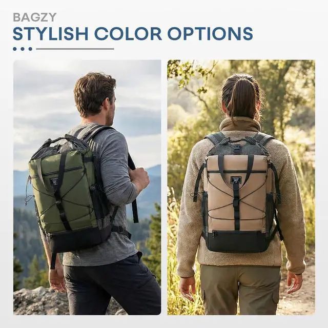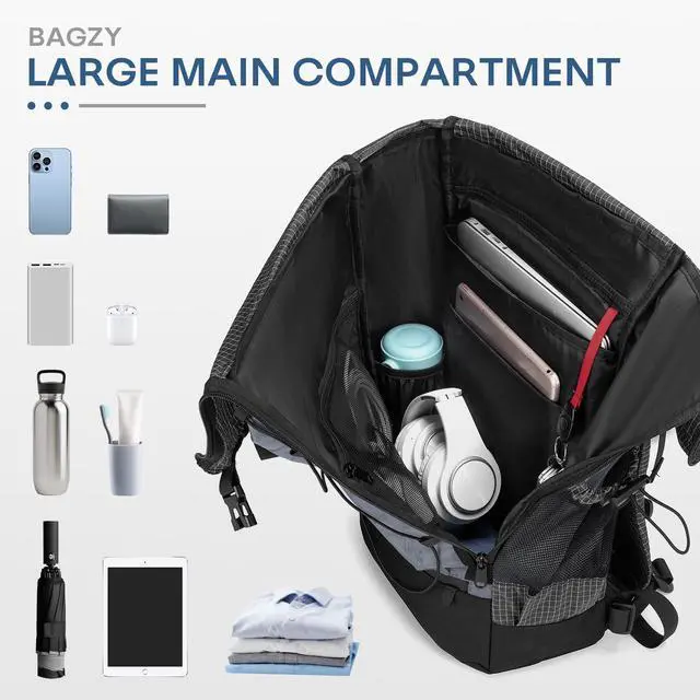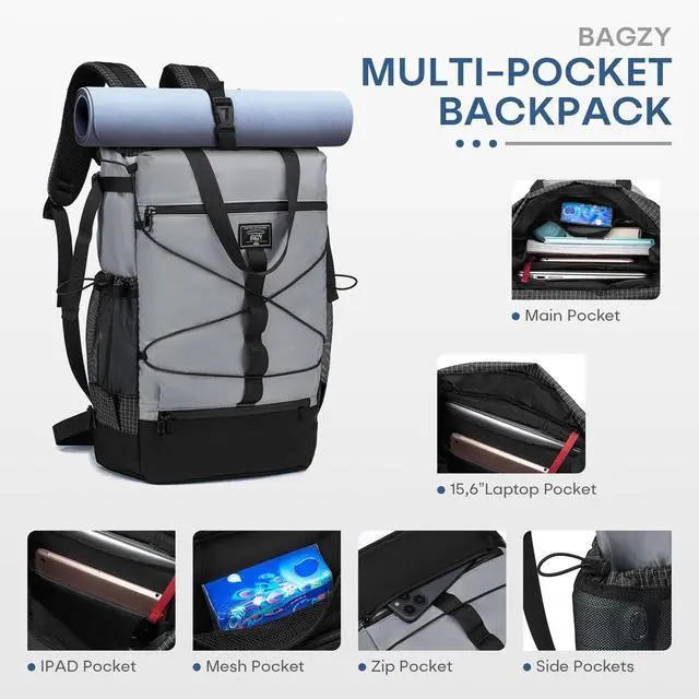 Personal Luggage SizeThe regular size of BAGZY roll-top backpack is 16x12x6 inches/40x30x15 cm (capacity is about 20 liters), suitable for carry-on luggage size on airlines. Easily fits under seats and on top of luggage racks. No additional baggage fees are required. ^^ Durable Waterproof MaterialThe travel backpack is made of lightweight and tough waterproof polyester fiber, which is not only tear-resistant but also effectively blocks moisture. There is a vertical zipper design on the side, and the large opening allows quick access to the items in the laptop compartment from the side, and the items inside are clearly arranged.