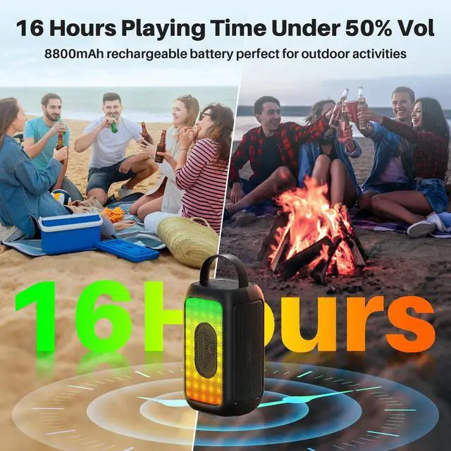 Playtime: The portable speaker with built-in 3.7V 8800mAh durable battery supports up to 16 hours of playtime per charge(50% volume), and plays longer time on lower volume. Actual playing time is related to song type, volume level and RGB mode. It's a good choice for parties, family gatherings and classroom activity ^^ Loud Stereo and