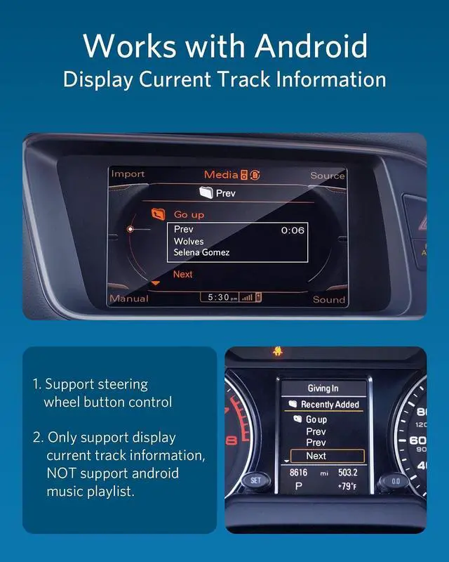 Important note: AMI iPod cable is NOT included in the product package ^^ [SUPPORT STEERING WHEEL SONG BUTTON CONTROL] Using steering song buttons to control music previous/next tracks ^^ [SUPPORT HEAD UNIT RADIO BUTTON CONTROL] Using head unit radio buttons to control music. Only support Apple Music playlist display, NOT support Spotify/Pandora playlist display. Song information display is ony supported for iPhone, NOT supported for Android ^^ [POWERED BY QUALCOMM CSR8675 CHIPSET] Adopted powerful Qualcomm CSR8675 chipset for better sound quality experience. Support 24Bit audio processing and 120MHz DSP, support APTX, APTX-LL, APTX-HD high-quality transmission format