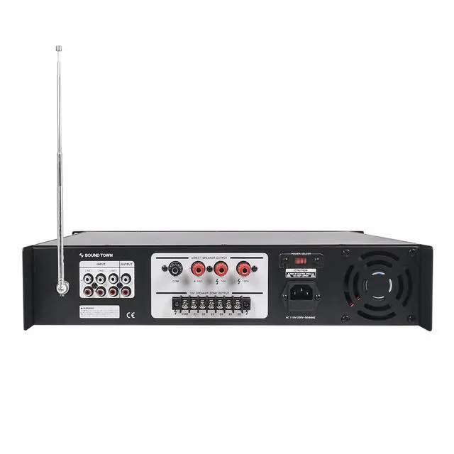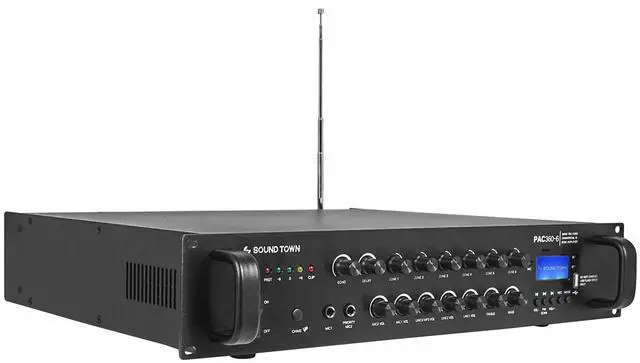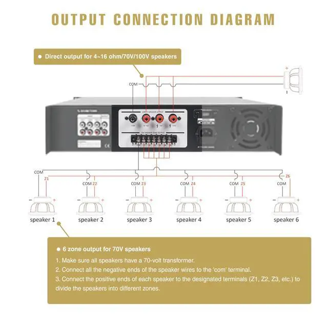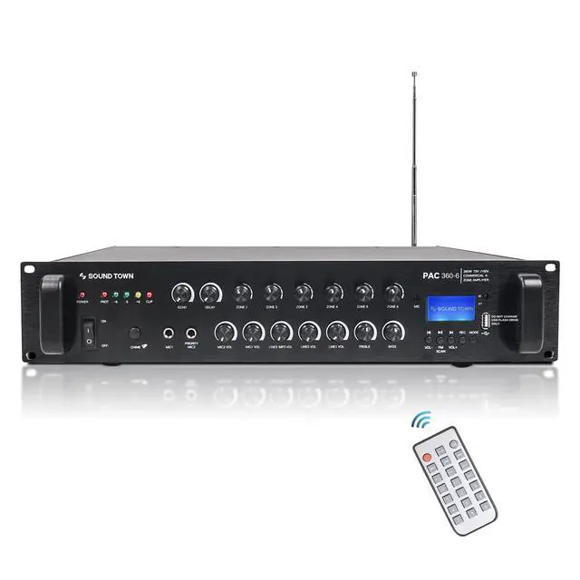 The commercial (public address) power amplifier has a 6-zone speaker output with individual volume control; cast-aluminum panel and integrated handles for enhanced durability ^^ Versatile inputs with 3 sets of RCA inputs, 2 mic inputs (including 1 priority mic), USB input, FM radio tuner, FM antenna and Bluetooth for easy connection to audio streaming devices; each of the 2 mics has speed and echo control ^^ Built-in clipping limiter and reliable cooling system protect your speakers and amplifiers from overheating ^^ The audio amplifier is ideal for multi-room applications or broadcasting system such as restaurants, lounges, bars, pubs, schools and warehouses