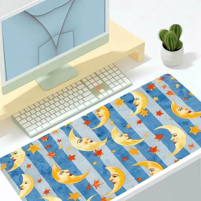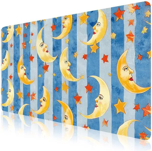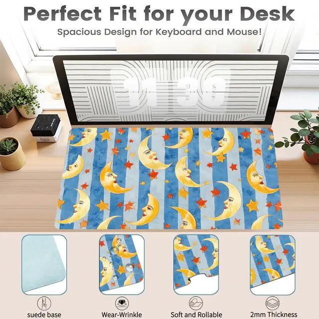 Pad Size: This cute Blue moon star desk pad measures 27.6 ''X 13.8 '' inch ( 60*30 cm). The keyboard and mouse pad is large enough to have a mouse, gaming keyboard, and shields your desk from scratches. Durable Non-Slip MaterialExpertly crafted from premium leather and faux suede, this cute Blue moon star large desk mat exudes durability. This kawaii pattern large mouse mat firmly grips the desktop to ensure stable operation of your mouse and keyboard. It's specially designed for use on both sides, featuring a beautiful aesthetic print on the front, the back is solid color. creating a 2-in-1 desk pad. Waterproof & Easy to