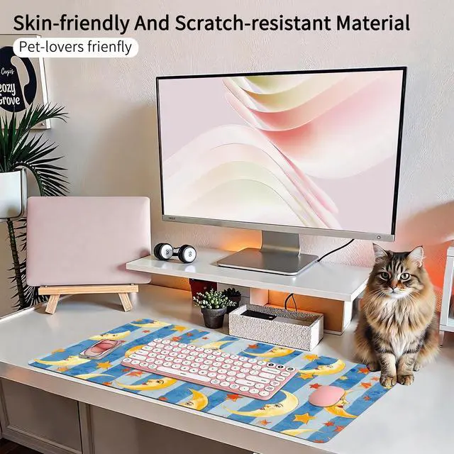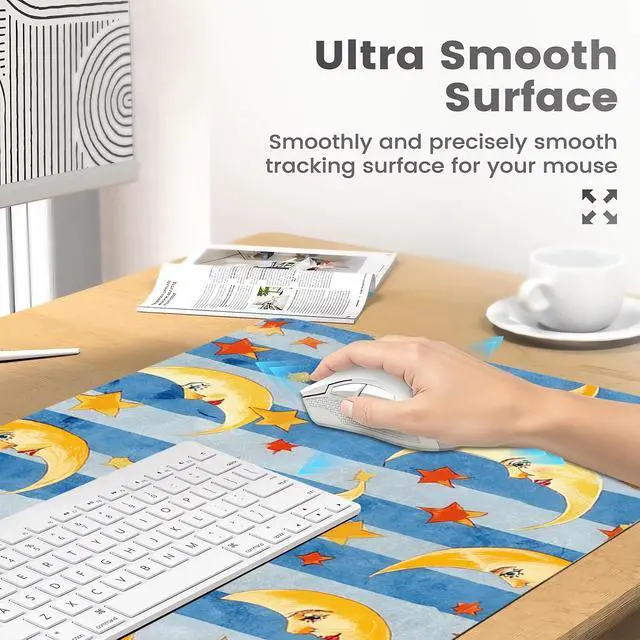 Clean: Protect your desk with our cute Blue moon star easy-to-clean desk mat. This kawaii pattern table mat pad waterproof surface ensures effortless maintenance. This large table mat provides us with a comfortable touch while protecting the tabletop from scratches. including scratches, stains, spills, and heat. Cleaning is a breeze; just wipe it with a damp cloth or tissue. Smooth Surface Desk Mat The aesthetic table mat's smooth surface allows for quick mouse movement while maintaining excellent accuracy and control. The kawaii pattern desk mat's premium material offers maximum comfort for your wrist whether you're writing, typing, browsing, sliding your mouse, gaming, or even restingBeautiful Desk Mat for