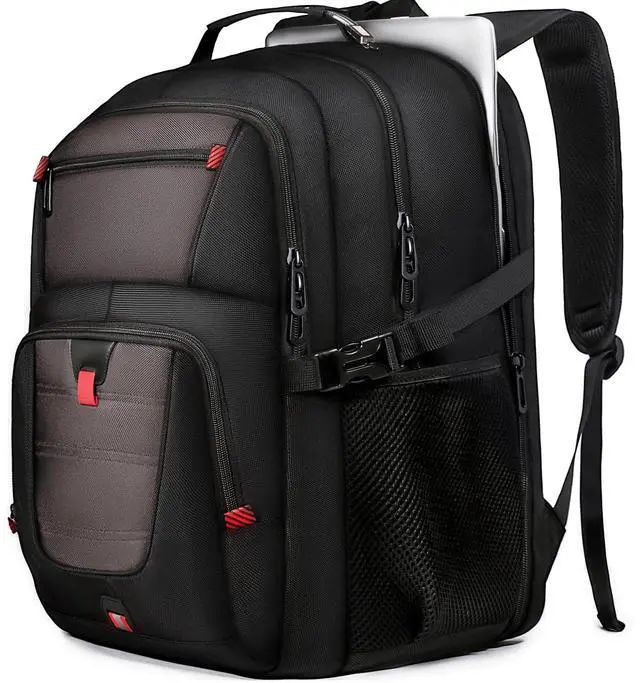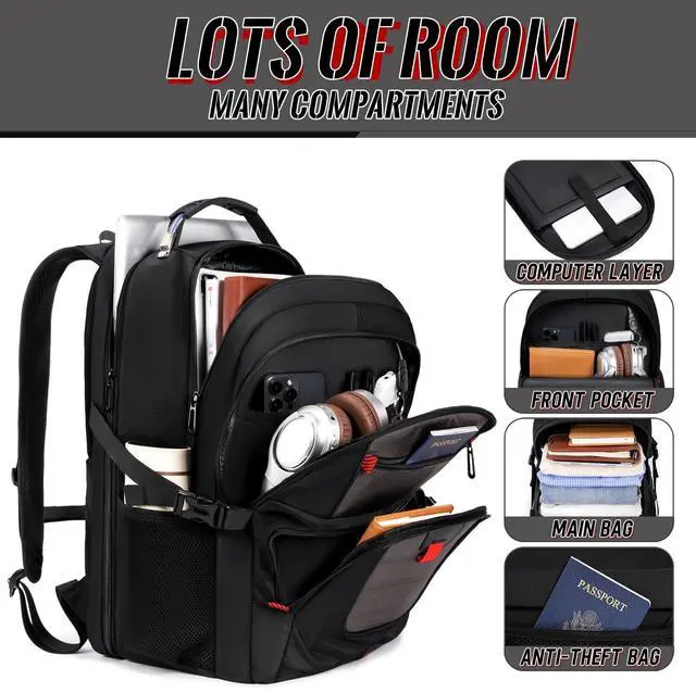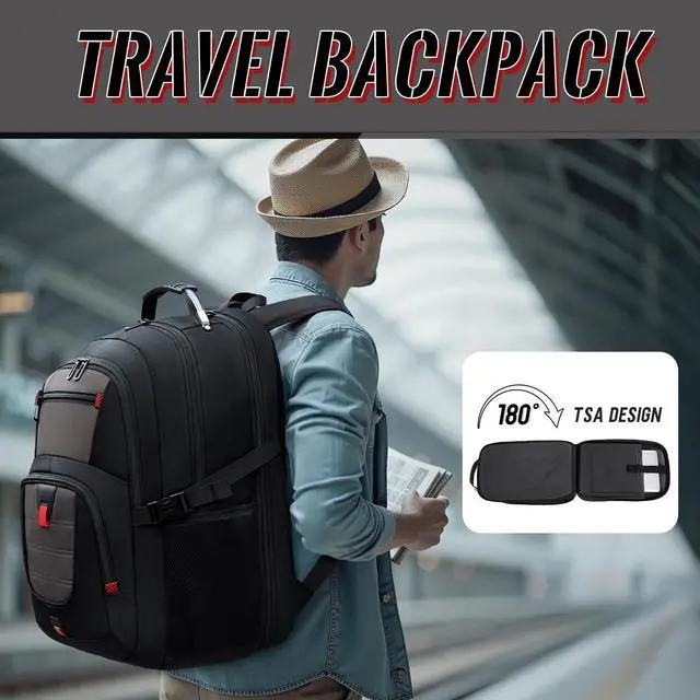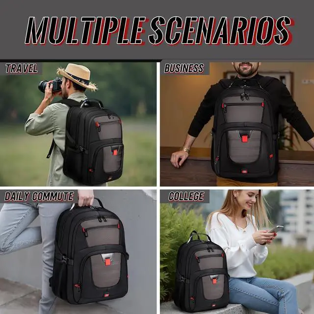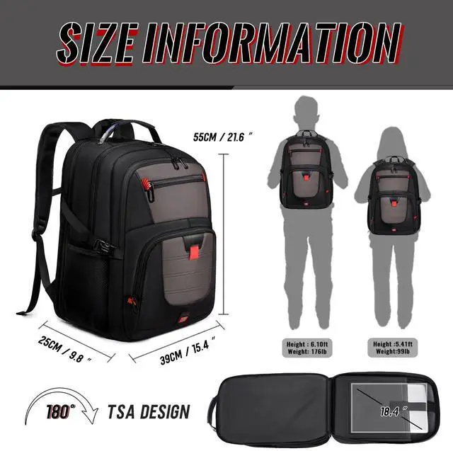 INCH LAPTOP COMPATIBILITY & PROTECTION: Engineered for oversized tech, this pack features a massive compartment that fits 18.4" gaming laptops like Alienware and MSI. The internal vault is fortified with 360 high-density foam padding and a "Suspended Cradle" system that prevents your device from hitting the ground. It is the ultimate insurance for keeping your expensive hardware safe from drops, shocks, and scratches during every commute and travel. ^^ 55-60L EXTRA LARGE CAPACITY & MODULAR ORGANIZATION: Boasting a staggering 55-60L of storage, this rucksack is a true "travel trunk" on your back. It features 20+ specialized pockets and 3 main compartments to hold a weeks worth of clothes, keyboards, VR headsets, and textbooks simultaneously. The deep, wide-body design ensures bulky items fit without straining seams. Whether you are a digital nomad or a student with a heavy load, this bag provides the space you need. ^^ TSA FRIENDLY DESIGN & SEAMLESS AIR TRAVEL: Navigate airport checkpoints like a pro with our 180 lay-flat TSA design. This oversized pack opens quickly for X-ray scanning, allowing you to keep your 18.4" -19" laptop inside. Dimensions are optimized as a carry-on for most international flights. The heavy-duty luggage sleeve allows you to slide the pack over suitcase handles, transforming a heavy load into a balanced, hands-free travel experience across global terminals and commute stations. ^^ ADVANCED TECH HUB & ERGONOMIC WEIGHT DISTRIBUTION: Stay connected with integrated USB-C and USB-A charging ports for high-speed power pass-through. Weve engineered an elite ergonomic system featuring multi-panel airflow padding and S-shaped reinforced straps. The adjustable chest strap and load-lifting buckles distribute weight across your torso, preventing back strain and ensuring "zero-gravity" comfort even when fully loaded with tech gear and travel essentials.