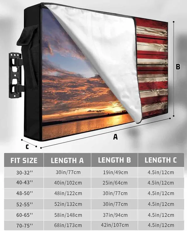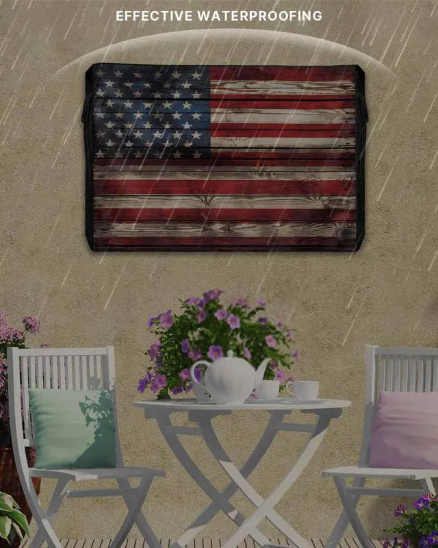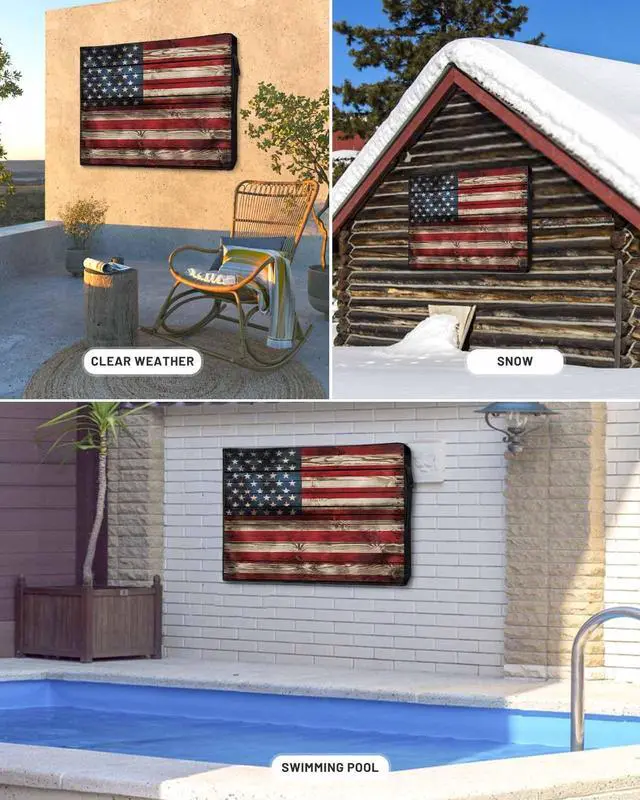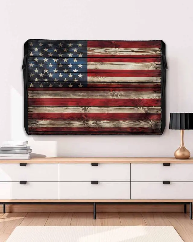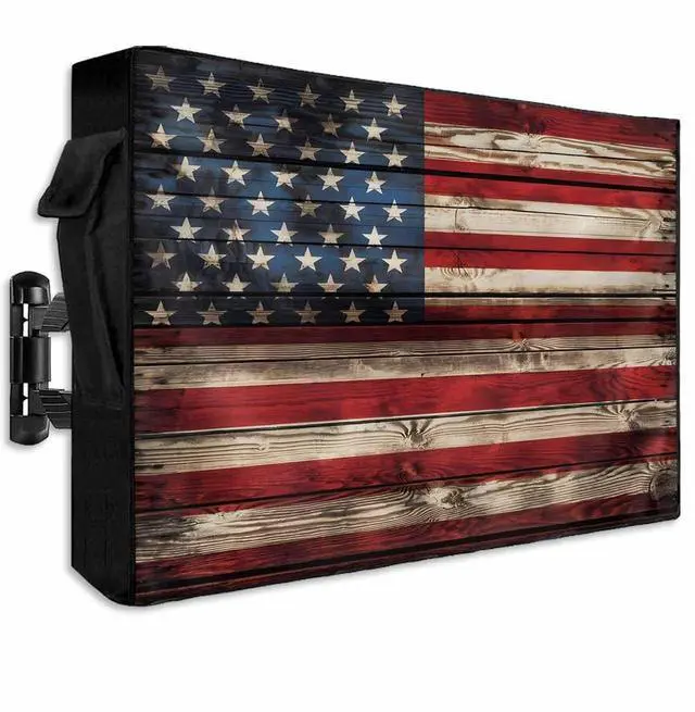 Screen ProtectorMaterial: 600D oxford clothWeatherproof & Waterproof-This Vintage US Flag outdoor TV cover ensures your TV is protected from dust, rain, snow, wind, moisture, even sunlight and other harsh elements, extending the life of your TV. Easy to Install and Maintain-The TV cover requires no special skills to install on the wall, this straps and zipper design is simple and convenient, you can easily install the TV cover to any TV. Machine washable, not easy to fade and deform. TV Mount Compatible-There are various opening methods on the back of the TV cover, which can be paired with different TV mounts, including swivel TV mount, tilting TV Mount, ceiling and floor tv mount. You can use outdoor tv cover waterproof to cover your desktop, wall-mounted and curved screen televisions. Decorations & Gifts-TV screen protectors uses double stitching to ensure that the outdoor TV cover retains its shape and looks great, as well as a beautiful pattern, making it a perfect outdoor decorations for pool party/patios/decks/yards/porch, etc., and is also a wonderful Christmas/Halloween/Thanksgiving/Independence Day/birthday/housewarming gift for family and friends.