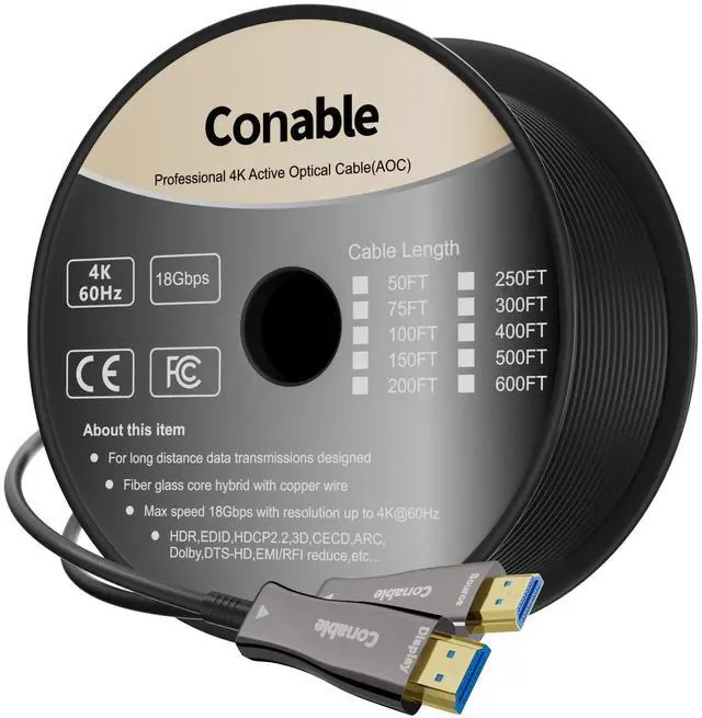 Conable 4K HDMI CableSuitable for TV, Computer, Laptop, Monitor, Projector, Game Console and More. You can choose different lengths as needed. (Length selection from 50ft to 600ft) Product FeaturesZinc alloyGold-Plated ConnectorHybrid pure glass and OFC conductorExtremely thin and flexible, OD: 4.8 mm