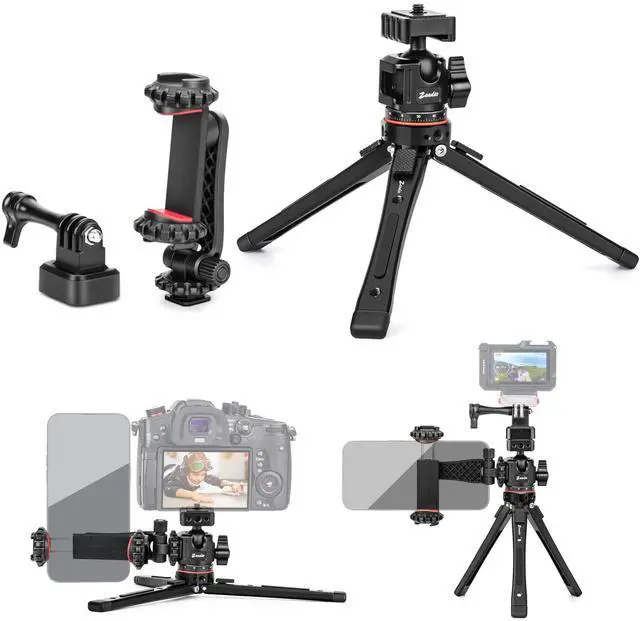 Camera Tripod: Features a universal 1/4" screw design compatible with all cameras, gimbals, and action cameras. The top base side includes one 1/4" screw hole and two positioning holes for stable mounting. 360 Rotating Ball Head with