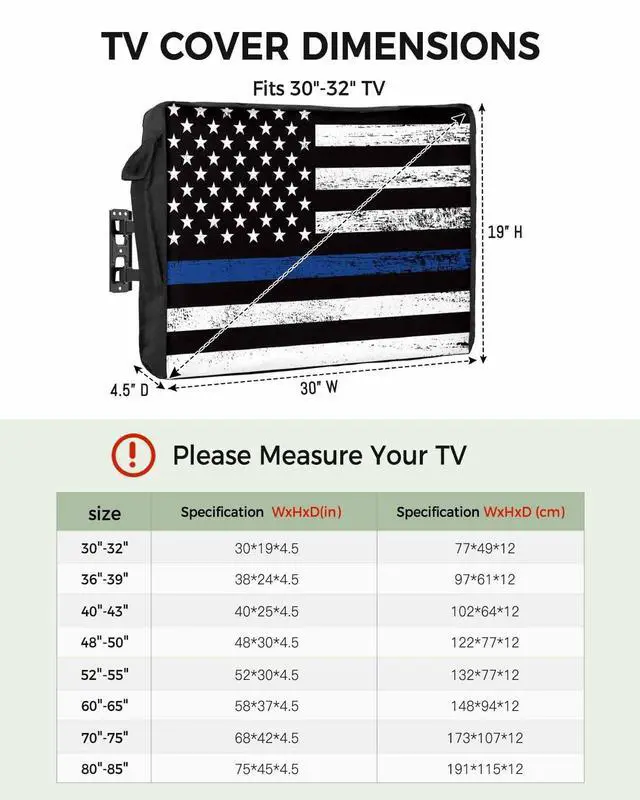 TV Cover Outdoor - Decorations & GiftsTV screen protectors uses double stitching to ensure that the outdoor TV cover retains its shape and looks great, making it a perfect outdoor decorations for patios/decks/yards/porchs, etc., and is also a wonderful Christmas/Halloween/Thanksgiving/Independence Day/birthday/housewarming gift for family and friends. Cover for Outdoor TV - Machine WashableOutdoor tv cover weatherproof are easy to care for and can be washed in the washing machine.