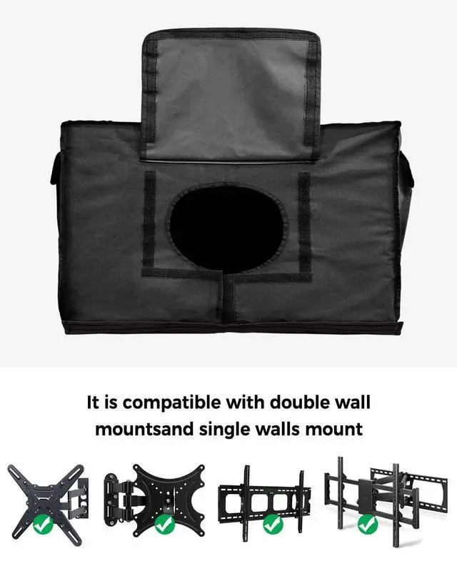 Outside TV Cover - TV Mount CompatibleThe remote control pocket on the back is designed so that the TV cover fits the most universal TV wall mount brackets, double wall, single wall, tilting TV mount and can accommodate a variety of mounting brackets. Outdoor TV Covers - 3 Pockets DesignThe added pocket on the back of the TV cover for moving is a great feature for storing remote controls, keeping them within easy reach, and the 2 side pockets can also be used to store other items. TV Outdoor Cover - Easy to InstallDesigned with hook tape, this TV cover for outside is more and convenient than zippers, making it easy to slide onto any TV and install.