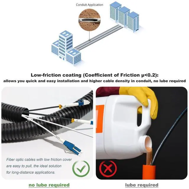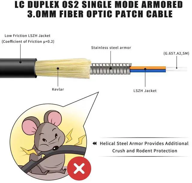 Low Friction LSZH jacket: Made of Ultra Low Friction flame retardant LSZH jacket (Coefficient of Friction < 0.2 ), which allows you quick and easy installation and higher cable density in conduit. ^^ Rugged OS2 Duplex Armored