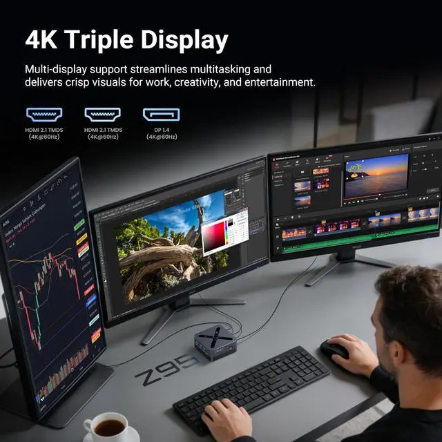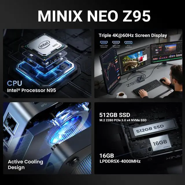4K Triple Display Productivity Equipped with dual HDMI 2.1 TMDS and DisplayPort 1.4 4K@60Hz, this mini computer supports up to three 4K monitors simultaneously, letting you work across multiple screens efficiently without constant switching ^^ Efficient Multitasking PerformancePowered by Intel 12th Gen N95, 16GB LPDDR5X 4000MHz RAM (on-board), and 512GB NVMe SSD. Includes 3 USB 3.2 Gen1 ports, 3.5 mm audio jack, and pre-installed Windows 11 Pro for smooth multitasking and reliable daily performance ^^ Dual Gigabit LAN for Stable NetworkingBuilt with two Ethernet ports for reliable wired connections, perfect for home NAS, lightweight servers, digital signage, or network-intensive business tasks ^^ Quiet Cooling for Long HoursAdvanced heat pipes, large heatsink, and centrifugal fan keep noise under 30dB, ideal for offices, home workspaces, and 24/7 long-running tasks.
