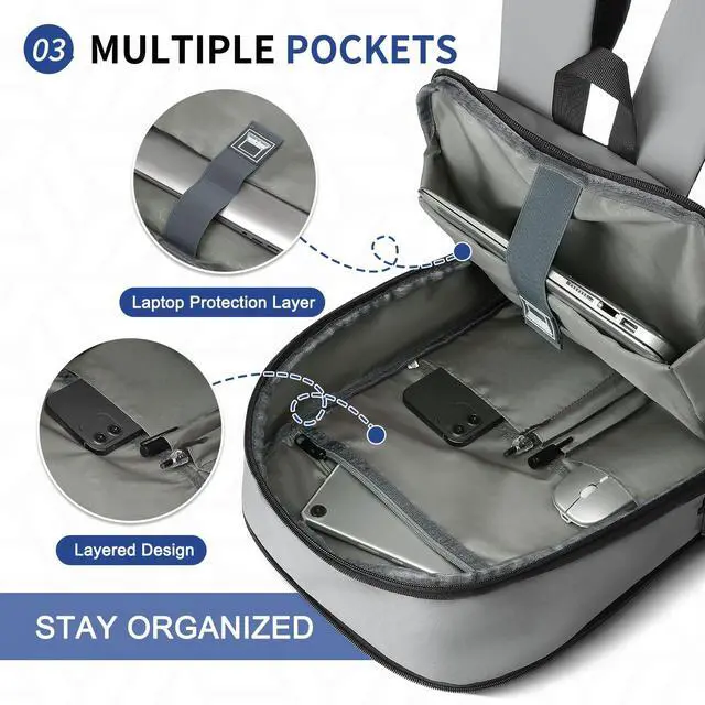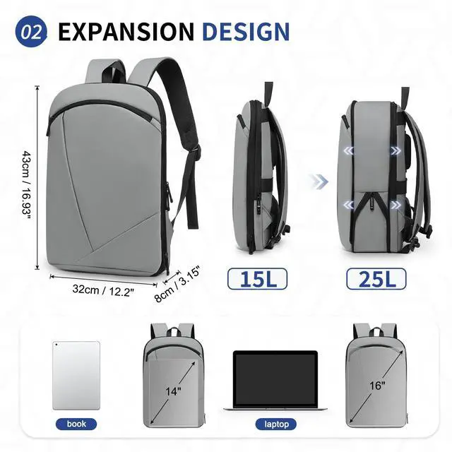 DescriptionSlim & Lightweight"Designed for urban workers, this ultra-slim backpack adds zero bulk while carrying your daily tech essentials. "Expandable Storage, Simplified"Go from office to overnight trip effortlesslythe expandable compartment smartly fits extra gear without loose its sleek profile. "All-Day Comfort, Engineered"Breathable mesh padding and weight-distributing straps keep you cool and strain-free, even during marathon workday. "Fly Through Security"TSA-friendly design fits under airplane seats and holds a 16" laptop and 3 days' worth of travel essentialsno checked baggage needed. "Everything in Its Place"A dedicated laptop sleeve, quick-access pockets, and cable organizers turn chaos into instant efficiency.
