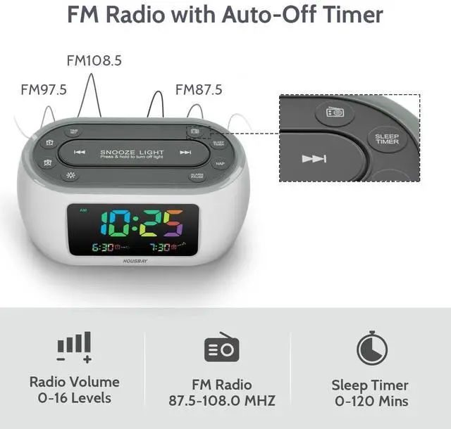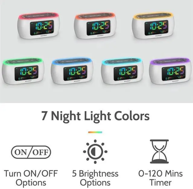 [ 3 IN 1 CLOCK RADIOS ]- Glow combines an alarm clock, nightlight, and FM radio in one, compact but mighty. Adjust nightlight color, brightness, alarm sound, and volume level to your preferences, and the size doesn't take up much space on your nightstand. ^^ [ COLORFUL DIGIT WITH DIMMER ]- Cute Rainbow LED digits are easy to see across the room and more fun. The brightness can be easily adjusted from very bright to fully dark with the dial display dimmer. ^^ [ DUAL ALARM & NAP TIMER ]- Dual alarm with 3 alarm sounds (favorite radio station/beep/birds chirping) satisfies different schedules for you and your family.