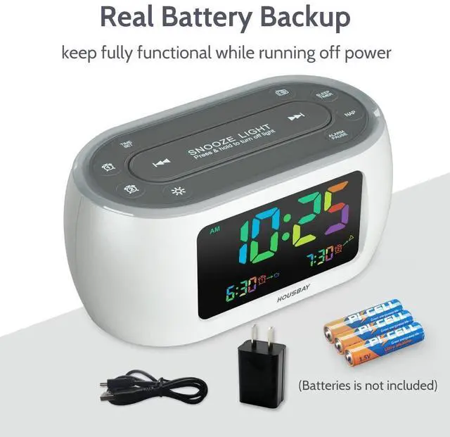 The adjustable nap timer wakes you up without resetting your regular alarm setting. ^^ [ NIGHTLIGHT & RADIO WITH AUTO-OFF TIMER ]- 7 colors nightlight with 5 level brightness (or even turn off) & radio for bedtime music adds an element of charm to your bedroom. Set an optional sleep timer to turn off the nightlight and FM radio or play all night. ^^ [ OUTLET POWERED AND REAL BATTERY BACKUP ]- Glow is outlet powered and can be backup with 3*AAA batteries (NOT included). Glow stays fully functional, time will show, and your alarm will still wake you up in the morning while running off batteries.