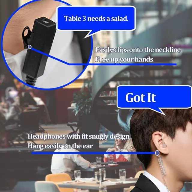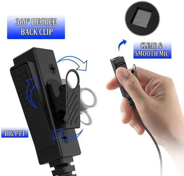 Earpiece cable length: 57 Inches ^^ Detachable Clear Tube Earbud comfortable soft silicone clear earplugs that won't make your ears sore even after long periods of wear. And the transparent tube part can be freely removed to replace, environmentally friendly ^^ 2 Pcs 360 Degree Back Clip You can fix the microphone and speaker at the difference part ^^ Big PTT Button for MicrophoneEasy to operation even if wearing gloves ^^