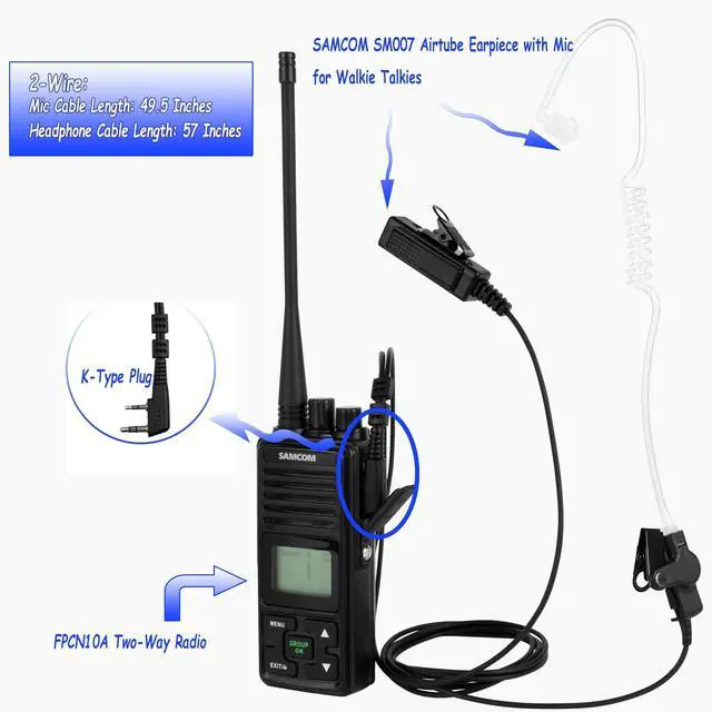 SAMCOM surveillance transparent acoustic tube earpiece with 2 pin K type 3.5 / 2.5 mm plug, applicable to FPCN10A/FPCN30A and some of 2 pin interfaces walkie talkies ^^ Small Tips This 2 Pin plug earpiece Do not use for Motorola and Midland Radio. Please confirm your radios jacks before purchase ^^ 2-wire Long Cable Unique Design For separate speaker and separate microphone, no interference with each other, clear sound quality.