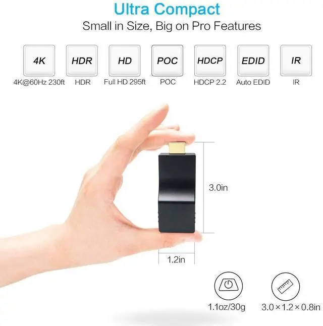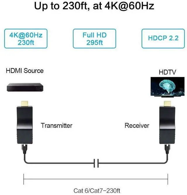 Performance: Extends Ultra HD 4K@60Hz HDMI video & audio up to 230ft (70m) over a single CAT5e/CAT6 cable with no latency and no signal loss. Extends Full HD 1080p at 295ft (90m). Supports HD audio for a full range of audio formats, such as Dobly TrueHD, DTS-HD Master audio, LPCM, DTS, Dobly-AC3/DSD, etc. Compactible with HDMI 2.0, HDCP 2.2, HDCP 1.4. Supports 20~60KHz wide frequency IR remote control. Supports HDR for vibrant video.