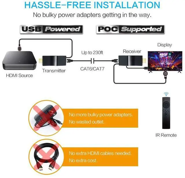 ^^ USB-Powered: Powered by universal USB connection. No proprietary AC power adapters required. Supports POC (Power Over Cable), only need to power on the receiver unit. Perfect for projection system, digital signage, and extending from where power outlet may be limited.