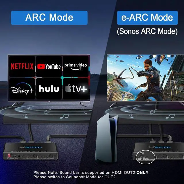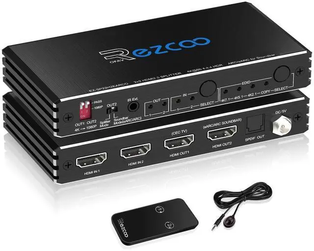 HDMI OUT supports D-olby Digital 7.1CH, SPDIF supports 5.1CH only. Can not play 2 different audio channels. If there is no image or sound, you can power on the product again or replace it with an HDMI cable smaller than 3M that meets the specifications ^^ HDMI Splitter EDID KEY USAGEOutput2 support ARC/eARC for soundbar when the out2 switch set to soundbar mode(ARC/eARC). HDMI source devices to HDMI Splitter input. each display (monitor or projector) to the HDMI Splitter output. TURN the scaler ON will output 1080P signal; TURN the scaler OFF position will pass through signal; Set EDID via panel button Select Audio/Video formats.