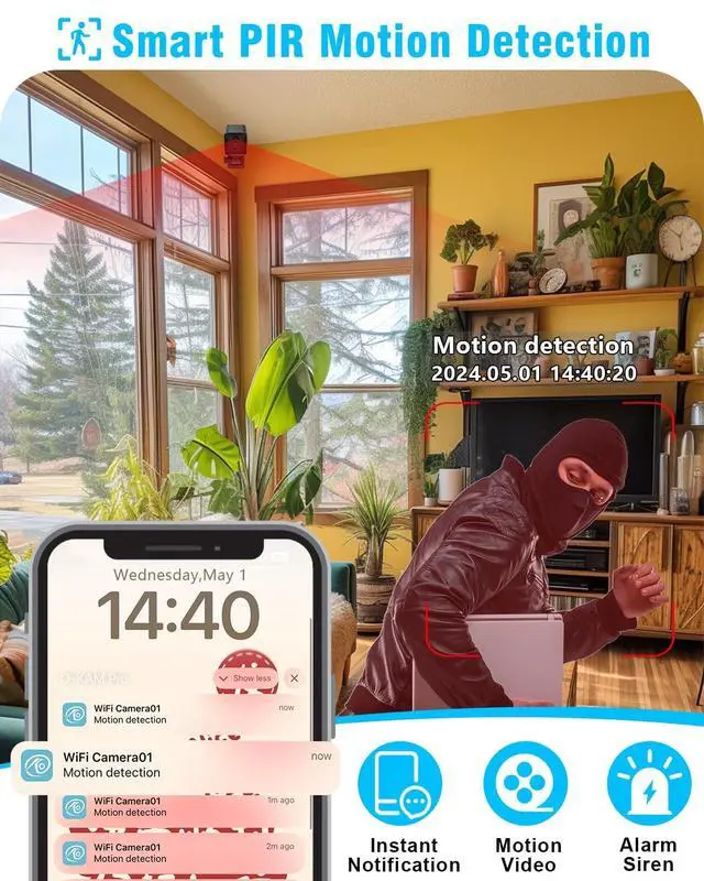 ^^ Equipped with smart PIR motion detection sensor, this hidden camera will keep you informed of any new occurrences. Its precise CMOS digital image sensor promptly sends APP notifications to your phone in the form of video clips when motion is detected, accurately identifying and locating humans to improve alert accuracy. The APP's siren alarm can also warn and expel unexpected individuals and animals, making it good for baby monitoring, elderly care, pet surveillance, car security, intrusion detection in indoor and public spaces. ^^ Seamless Wi-Fi connectivity ensures remote monitoring of indoor security areas.