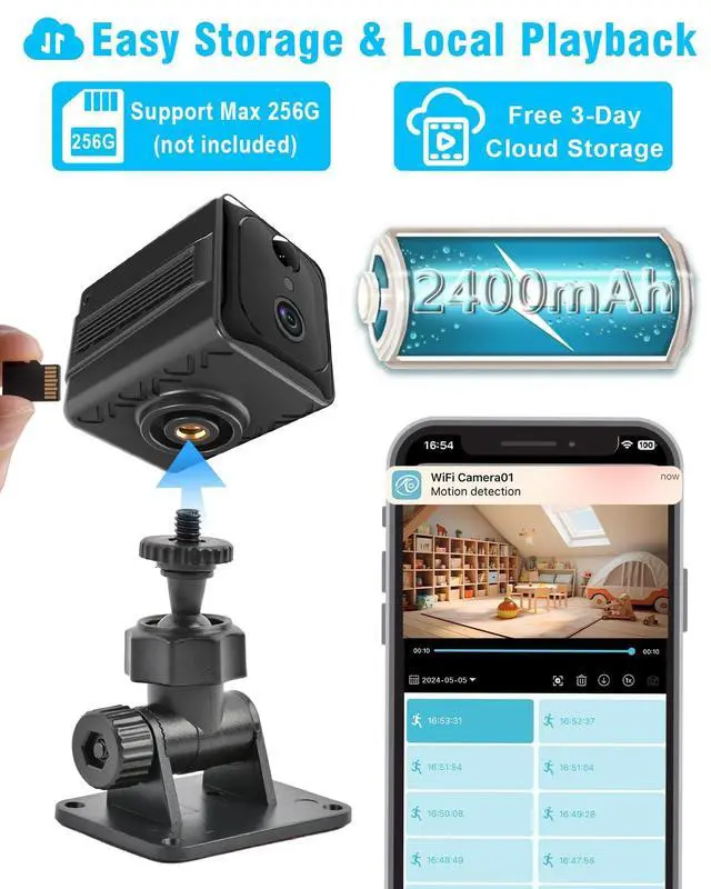 Simply connect the camera to 2.4G WiFi network and get real-time access through our dedicated app from anywhere (APP enhanced privacy protection). Stay informed about ongoing activities at all times, providing peace of mind while away for work, shopping or exercise as the camera intelligently safeguards your family and indoor possessions and you can always get its live view. ^^ Local storage and playback allows you to easily access and view videos/images files direcly through the APP at any time! It provides a 3-day Cloud Storage in the app, and you can also opt to use a Micro SD card (up to 256G, not included) for additional storage.