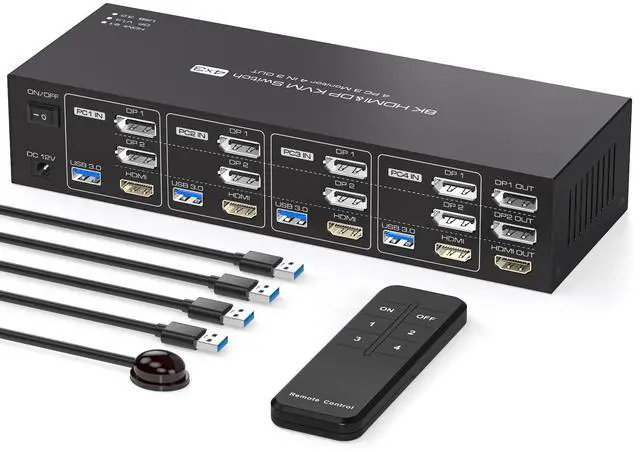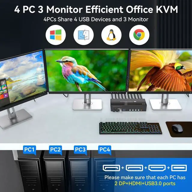 Note: Hotkey switching is not supported ^^ USB 3.0 High Speed TransmissionThe displayport and hdmi kvm switch is equipped with 4 high-speed USB 3.0 ports, with data transfer rates of up to 5Gbp/s, 10 times faster than USB 2.0. With backward compatibility for USB 2.0 devices, the kvm switch 3 monitors 4 computers can seamlessly share wired or wireless keyboards and mice, printers, scanners, and network cameras. The KVM switch is made of high-quality and durable metal materials, providing reliable and long-lasting performance ^^ Widely compatibleThe kvm 4 computers 3 monitors is plug and play, no software drivers required, widely compatible with Windows/Vista/XP/Mac OS/Linux and Unix systems. It can be used in offices, conference rooms, multimedia classrooms, and other environments. If you encounter any problems during use, please contact us, we have a professional technical team to provide you with a solution