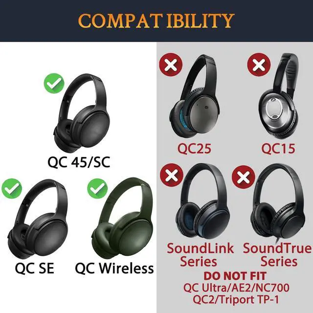 • Compatible With: QuietComfort 45 (QC45)/QuietComfort SC (QC SC)/QuietComfort 35 (QC35, QC35II)/QuietComfort SE (QC SE)/QuietComfort Wireless Over-ear Headphones only.