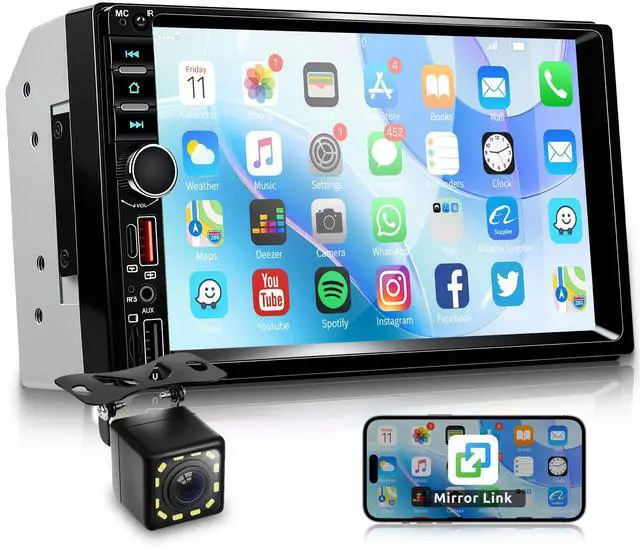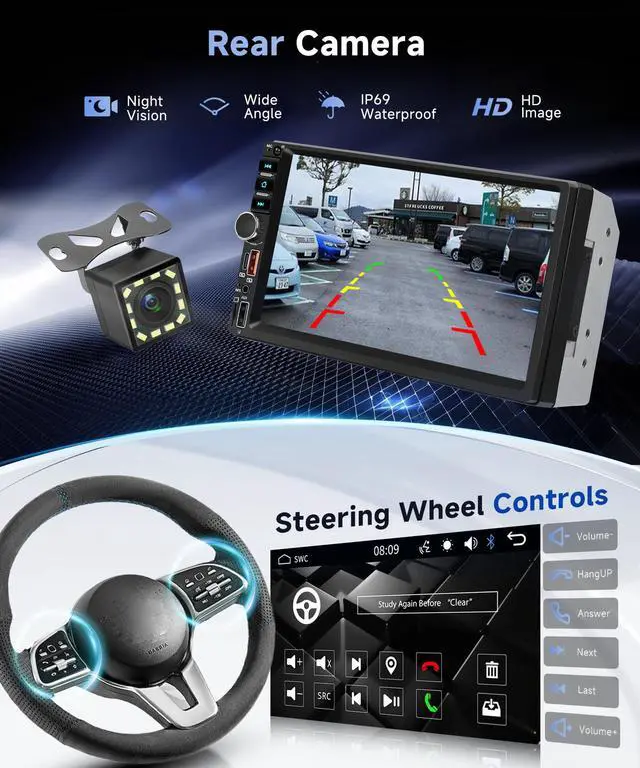 Note: The stereo player is not a GPS device, it gets the GPS navigation function when connected to the phone. ^^ Bluetooth & FM Radio 2 DIN Car Radio with Bluetooth. Car radio with microphone and integrated speaker, can make hands-free calls and Bluetooth connection to the mobile phone for playing music. Support FM radio tuners, high -quality stereo that can search manually or automatically for the desired channel. 18 preset radio stations. You can transmit real -time traffic, news programs, weather forecasts, etc. ^^ Sharing Screen - Car Headrest MonitorThe car radio supports screen sharing with the headrest monitor in the car, so you and your family and friends can have more fun on the road. ^^ Backup Camera & Steering Wheel Control Car Stereo 2 din with 12 LED reversing camera, easy to install, easy to use. If the vehicle drives backwards, the car radio screen automatically displays the return picture and records the driving situation, which makes daily reversal and more convenient. Support of the steering wheel control, control of the necessary functions via the steering wheel, conveniently and quickly.